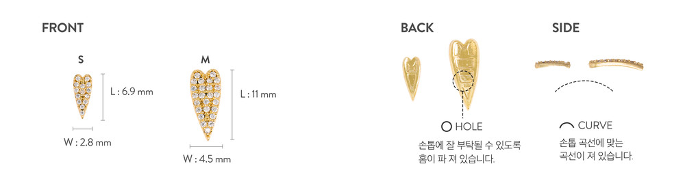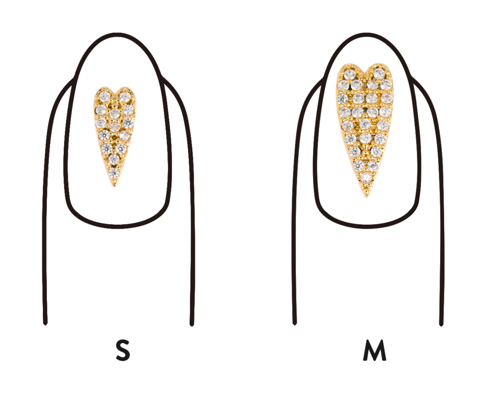 손톱에 부착하였을 때의 대략적인 크기입니다. 일반적인 손톱 사이즈의 스케일이며, 손톱 모양과 크기에 따라 다를 수 있습니다.