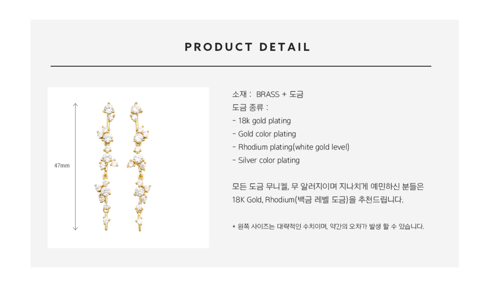 향수, 헤어스프레이, 로션 등과 같은 제품을 사용할 때에는 제품에 최대한 뭍지 않도록 해주십시오. 이는 제품을 손상시키고 도금의 수명을 단축시켜 변색이 될 수 있습니다. 딱딱한 물체와 접촉할 경우 스크래치 혹은 손상이 될 수 있습니다. 눌림이나 충격 등으로 스톤이 빠질 수 있으니 움직임이나 보관 시 유의해주시길 바랍니다.