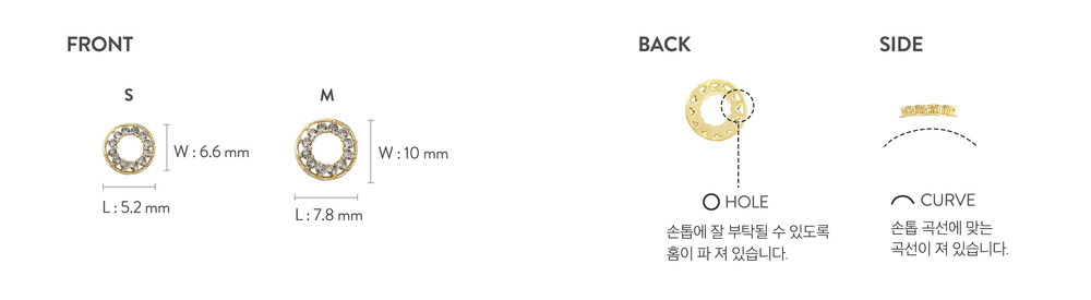 원형의 얇은 라인이 정교하고 섬세한 디테일을 둘러싸며 프롱 세팅되어 특별함이 살아있는 제품. 태양의 눈부신 순간을 나타냅니다. 아주 섬세하고도 복잡한 디테일들이 순간의 빛을 표현합니다. 이 제품은 단독으로 쓰였을 때 가장 빛을 발합니다. 손톱의 곡선에 맞게 약간의 굴곡이 져 있습니다.