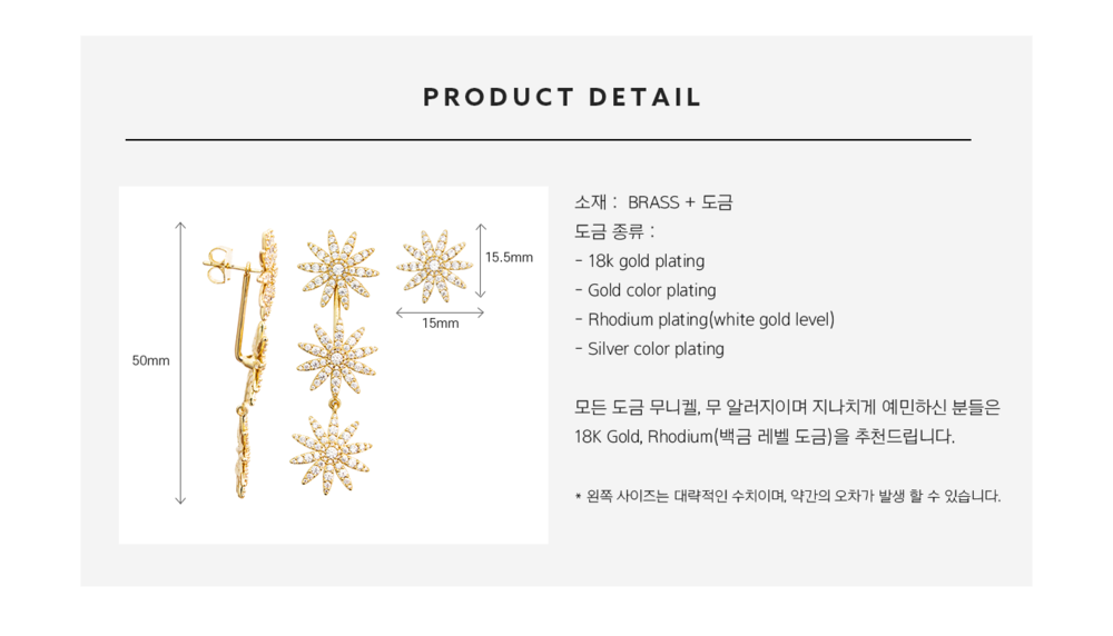 향수, 헤어스프레이, 로션 등과 같은 제품을 사용할 때에는 제품에 최대한 뭍지 않도록 해주십시오. 이는 제품을 손상시키고 도금의 수명을 단축시켜 변색이 될 수 있습니다. 딱딱한 물체와 접촉할 경우 스크래치 혹은 손상이 될 수 있습니다. 눌림이나 충격 등으로 스톤이 빠질 수 있으니 움직임이나 보관 시 유의해주시길 바랍니다.