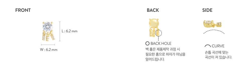 프롱 세팅된 5.3 mm의 화려한 컬러의 스톤의 제품. 이 스톤은 가지고 있는 색만으로도 충분한 매력을 발산합니다. 반짝이는 큰 사이즈의 스톤과 미니 펜던트들이 밝은 컬러들과 함께 사용하여, 컬러감을 살려주는 것이 좋습니다. 이 제품은 단독으로 사용하는 것이 가장 좋습니다. 패션과 함께 룩과 조화된다면 더없이 좋을 것입니다. 윗부분은 손톱 굴곡에 맞도록 약간의 곡선이 져 있습니다. 달랑이는 펜던트들은 달랑거릴 수 있도록 윗부분만 부착합니다.