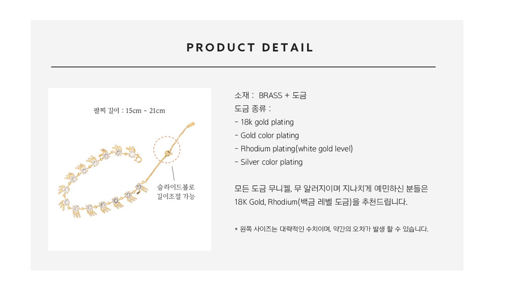 향수, 헤어스프레이, 로션 등과 같은 제품을 사용할 때에는 제품에 최대한 뭍지 않도록 해주십시오. 이는 제품을 손상시키고 도금의 수명을 단축시켜 변색이 될 수 있습니다. 딱딱한 물체와 접촉할 경우 스크래치 혹은 손상이 될 수 있습니다. 눌림이나 충격 등으로 스톤이 빠질 수 있으니 움직임이나 보관 시 유의해주시길 바랍니다.