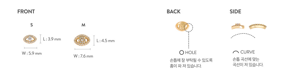 손톱에 부착하였을 때의 대략적인 크기입니다. 일반적인 손톱 사이즈의 스케일이며, 손톱 모양과 크기에 따라 다를 수 있습니다.