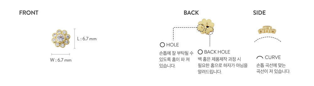 손톱에 부착하였을 때의 대략적인 크기입니다. 일반적인 손톱 사이즈의 스케일이며, 손톱 모양과 크기에 따라 다를 수 있습니다.