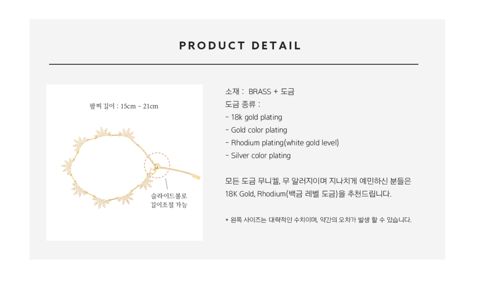 향수, 헤어스프레이, 로션 등과 같은 제품을 사용할 때에는 제품에 최대한 뭍지 않도록 해주십시오. 이는 제품을 손상시키고 도금의 수명을 단축시켜 변색이 될 수 있습니다. 딱딱한 물체와 접촉할 경우 스크래치 혹은 손상이 될 수 있습니다. 눌림이나 충격 등으로 스톤이 빠질 수 있으니 움직임이나 보관 시 유의해주시길 바랍니다.