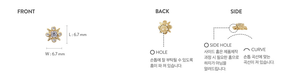 손톱에 부착하였을 때의 대략적인 크기입니다. 일반적인 손톱 사이즈의 스케일이며, 손톱 모양과 크기에 따라 다를 수 있습니다.