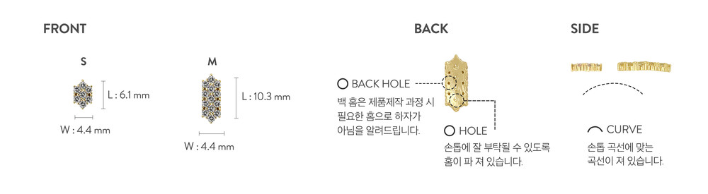 쉐어드 프롱 세팅의 복잡하고도 정교한 디자인의 제품. 이 디자인은 영롱한 컬러감을 나타내는데 초점이 맞추어 있습니다. 또한, 이 제품은 반복적인 패턴에 의해 영감을 받아 한 개 이상을 조합해서 반복적인 패턴을 만들어 낼 수 있습니다. 13개의 나노 스톤들이 펼쳐져 몽환적인 반짝임을 자아냅니다. 스몰과 미디움 두가지 사이즈가 있습니다. 두 가지 사이즈를 함께 믹스해서 사용하거나 자신만의 컬러 패턴을 만들어 낼 수도 있습니다. 스몰은 손톱의 수평 곡선에 맞게 약간의 굴곡이 져 있습니다. 미디움은 손톱의 수평과 수직 곡선에 맞게 약간의 굴곡이 져 있습니다.