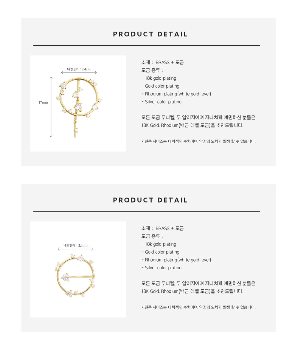 향수, 헤어스프레이, 로션 등과 같은 제품을 사용할 때에는 제품에 최대한 뭍지 않도록 해주십시오. 이는 제품을 손상시키고 도금의 수명을 단축시켜 변색이 될 수 있습니다. 딱딱한 물체와 접촉할 경우 스크래치 혹은 손상이 될 수 있습니다. 눌림이나 충격 등으로 스톤이 빠질 수 있으니 움직임이나 보관 시 유의해주시길 바랍니다.