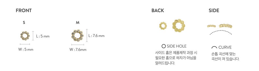 리스 형태의 벨트 세팅 제품. 심플하고 간결한 네일 디자인에 적합합니다. 단독으로 사용하여도 아름다움은 물론이고, 다른 제품들과 함께 사용해도 좋습니다. 스몰과 미디움 사이즈가 있으며, 손톱 사이즈에 맞는 제품 사용이 가능합니다.