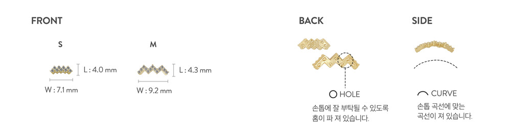 손톱에 부착하였을 때의 대략적인 크기입니다. 일반적인 손톱 사이즈의 스케일이며, 손톱 모양과 크기에 따라 다를 수 있습니다.