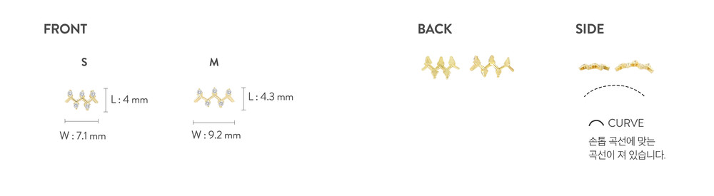 가느다란 지그재그 라인 위에 프롱세팅된 세련된 제품입니다. 이 제품은 지기잭 제품과 매치하거나 여러가지 컬러를 섞어서 사용하기에 좋습니다. 크기가 다른 손톱위에 사이즈별로 올리거나, 다양한 컬러 제품을 사용하여 각 색상이 어우러지도록 할 수도 있습니다. 하나만 사용한다면 깔끔하고 심플함을 강조할 수 있고, 5~6개를 쌓아서 화려한 지그재그 패턴을 완성시킬 수 있습니다.